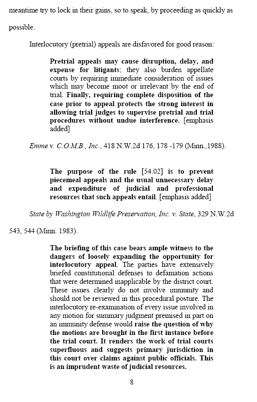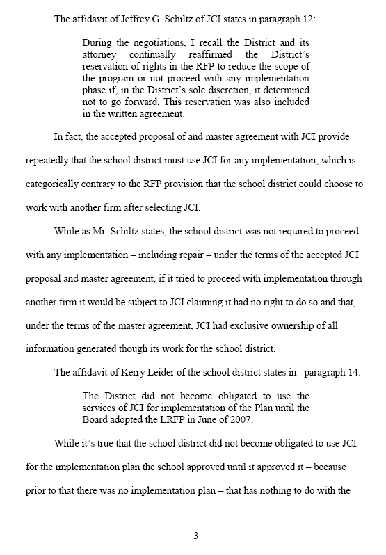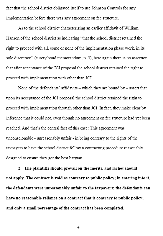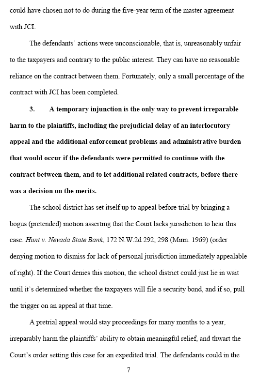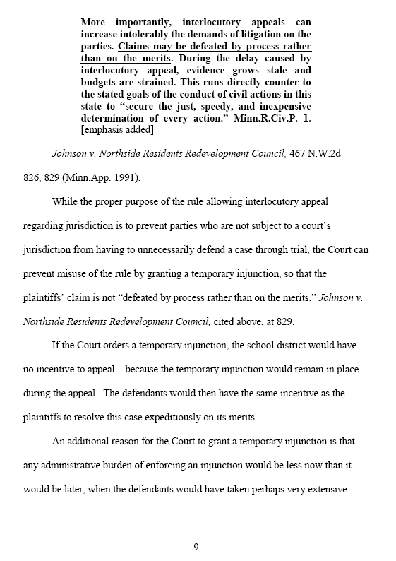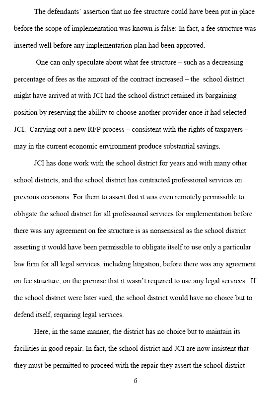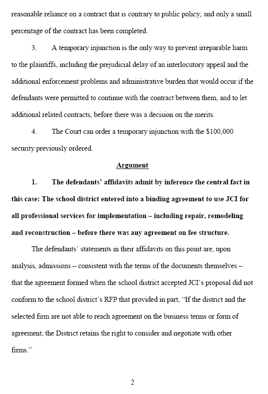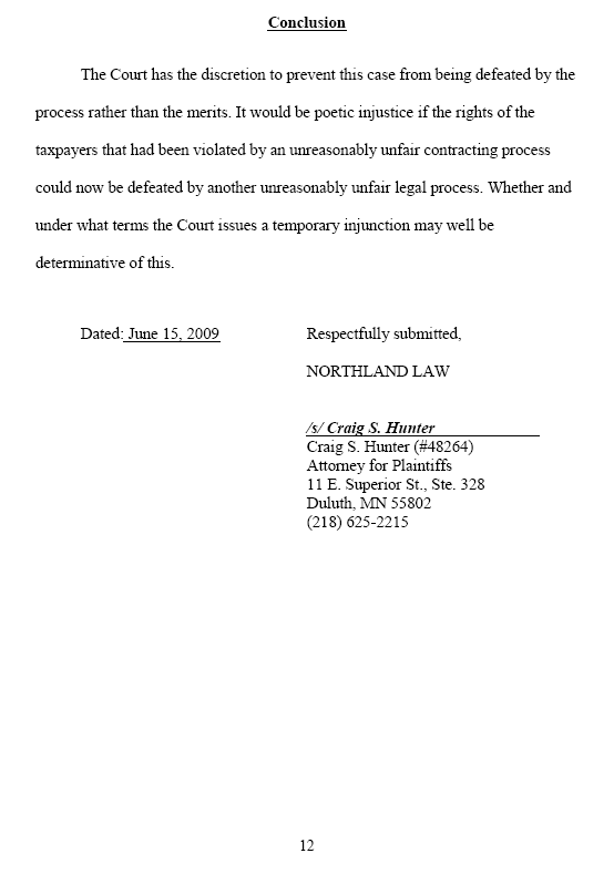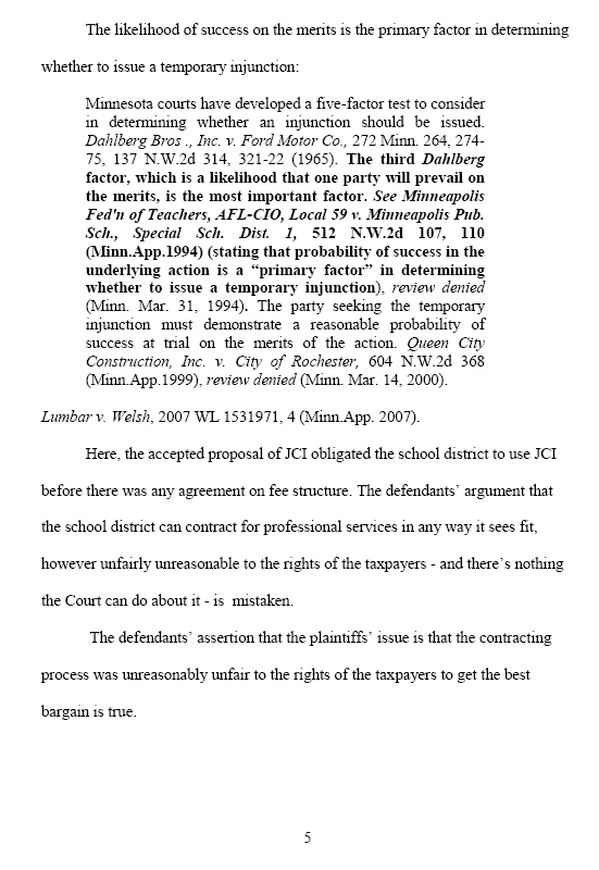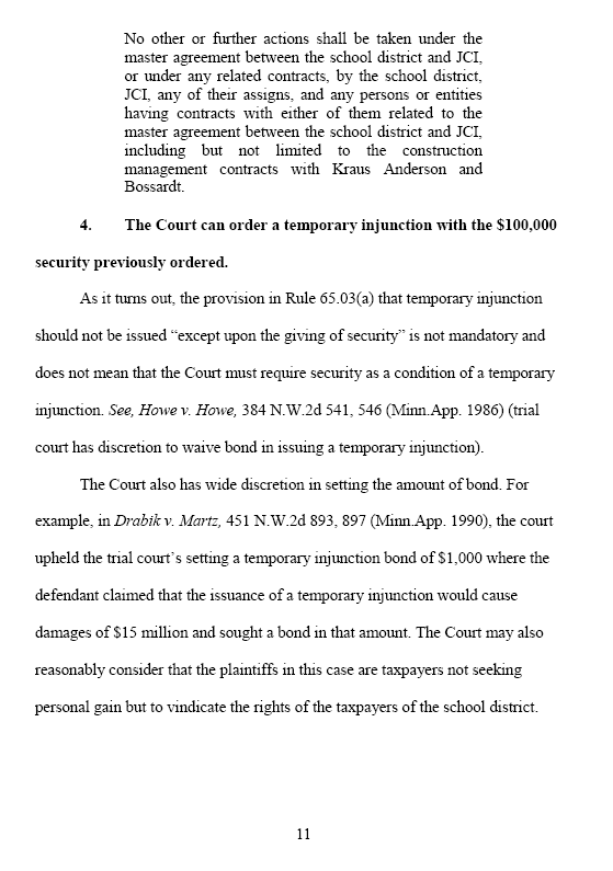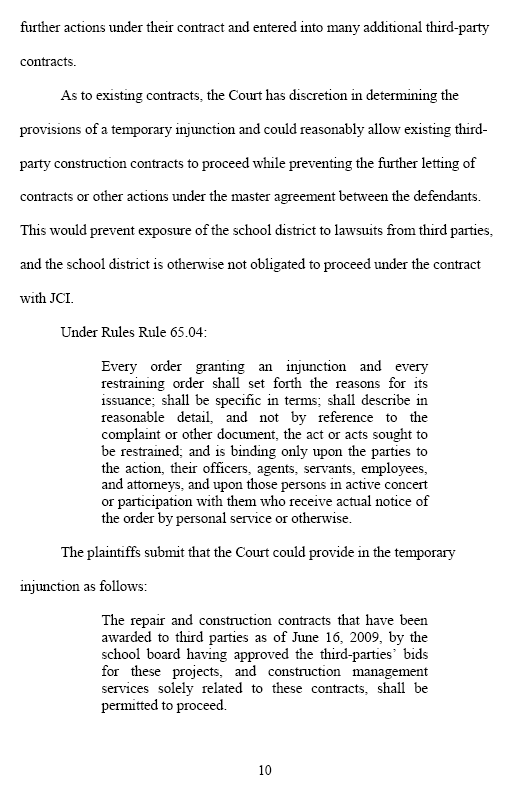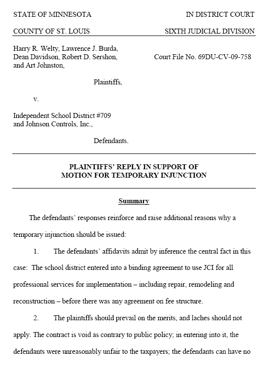 Temporary Injunction Two things could slow down the Red Plan. One is a requirement for an Envionmental Impact Statement which in light of the District's determination to cram elephant High into the Ordean phone Booth makes a great deal of sense. Second a temporary restraining order which the taxpayers have requested the Sixth District Court to impose until the Court hears and rules on our case this September. A third possible slowdown could result if the City Council votes to hold a referendum asking voters whether they wish to have the City drag its feet on permitting and variances for the Red Plan. We'll find out when the Council meets on June 15, 2009 whether this comes to pass or not. It seems unlikely. The decision on the EIS will come in July and may depend on the recommendation of the City Planning Staff which has received more objections to the Ordean plans from area neighbors than any other project in recent memory. As for the Temporary Injunction. This is new. The Taxpayers did not originally request this but after the Judge of the Sixth District imposed the relatively modest $100,000 bond and gave the plaintiffs 30 days to raise it it seemed prudent to ask that this be applied to an injunction on continuing construction. The judge has already granted the plaintiffs an expedited trial the first indication of the gravity of the case. Should he grant this request construction would end on all but those projects for which contracts have been signed. This is the Plaintiff's reply to the defendants objections to an injunction.