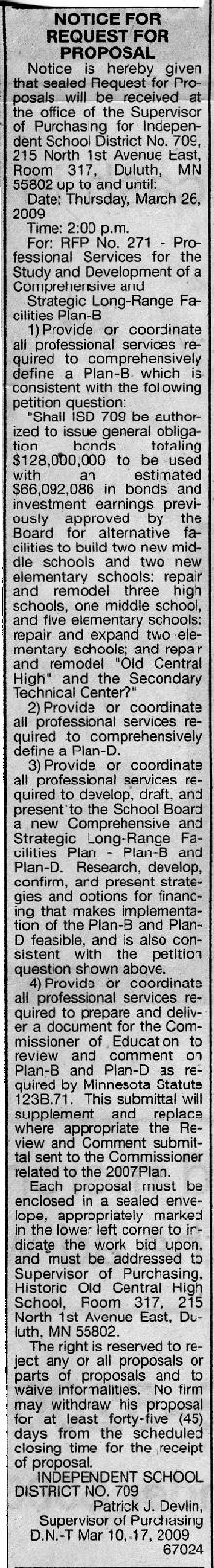 The Red Plan's supporters fuss a lot about what they claim is an ever changing Plan B. This overlooks the constant changes in the Red Plan which today has elements of the original Red, White and Blue plans which have been added and subtracted on somebody's whim ever since they were trotted out to the public. It continues to morph. New properties have been taken for parking lots. Stadiums have been added then downsized. Plan B must adhere to the 75 words in the Plan B Petition. Like the Red Plan there are numerous ways to implement Plan B. Board Chair Tim Grover originally drafted the Plan B petition and recommended that Let Duluth Vote circulate it because this might be accepted by the School Board as a sensible "compromise." Well, we know how that worked out. Now, a year after the original petition was handed to the School Board, under the orders of the Attorney General and The Minnesota Dept of Education Dr. Dixon's Administration is finally going through the motions of putting together a Plan B proposal for the State's Review. By now it is now impossible for any referendum on Plan B to be offered to voters before the construction on most Red Plan projects is well under way. Nonetheless, the Board set aside $250,000 to develop a plan for the state over the objections of Let Duluth Vote. We don't need that much money and resent being told the money being used to finance it is also meant to fight Let Duluth Vote in court. The School Board only did this to make the public mad at Let Duluth Vote for wasting precious resources during a time of financial ruin brought about because of the District's reckless spending. The School Board "borrowed" $5 million for classroom spending to pay for the Red Plan then announced they would gut Ordean Junior High two years ahead of schedule to save $750,000. If they simply transferred the $5 million back to the classroom this would be unnecessary. Gutting Ordean will require all its 7th and 8th graders to be sent to Woodland Jr. High. It will force Woodland Jr high students to be bussed to Morgan Park Jr. All the Ordean and Woodland sixth graders will be parked in Grant elementary and all the Grant students will be sent to Nettleton and all the Nettleton students will sit out the year without school........We're Sorry. That last part was just a joke added to the School Board's joke. How this much disruption and the transportation costs to pull it off could permit any savings is a mystery. Meanwhile the School District posted a Request for Proposal on Tuesday to put together a Plan B proposal that could only be put into effect if the District stopped the Red Plan which we know the Board won't do on its own and a non binding referendum on it passed and a new School Board elected this November and seated in Januay. Here's the ad. |